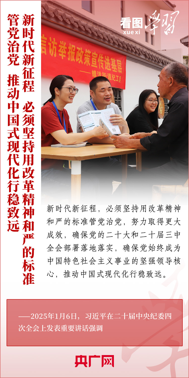 1月6日,習(xí)近平總書記在二十屆中央紀委四次全會上發(fā)表重要講話,充分肯定過去一年全面從嚴治黨取得的新進展、新成效,深刻分析當(dāng)前反腐敗斗爭形勢,對堅決打好反腐敗斗爭攻堅戰(zhàn)、持久戰(zhàn)、總體戰(zhàn)提出明確要求。總書記強調(diào),新時代新征程,必須堅持用改革精神和嚴的標(biāo)準(zhǔn)管黨治黨,努力取得更大成效,確保黨的二十大和二十屆三中全會部署落地落實,確保黨始終成為中國特色社會主義事業(yè)的堅強領(lǐng)導(dǎo)核心,推動中國式現(xiàn)代化行穩(wěn)致遠。一起來學(xué)習(xí)!