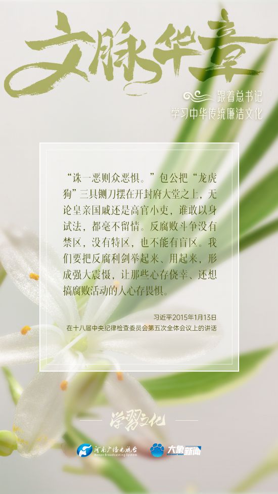 中華優(yōu)秀傳統(tǒng)文化蘊(yùn)含著豐富的廉潔文化,習(xí)近平總書(shū)記曾指出:沒(méi)有中華優(yōu)秀傳統(tǒng)文化、革命文化、社會(huì)主義先進(jìn)文化的底蘊(yùn)和滋養(yǎng),信仰信念就難以深沉而執(zhí)著??倳?shū)記常常引經(jīng)據(jù)典,教育引導(dǎo)廣大黨員干部正心修身,涵養(yǎng)文化,守住為政之本。大象新聞分五期為您梳理,我們一起跟著總書(shū)記學(xué)習(xí)中華傳統(tǒng)廉潔文化。今天推出第五期。