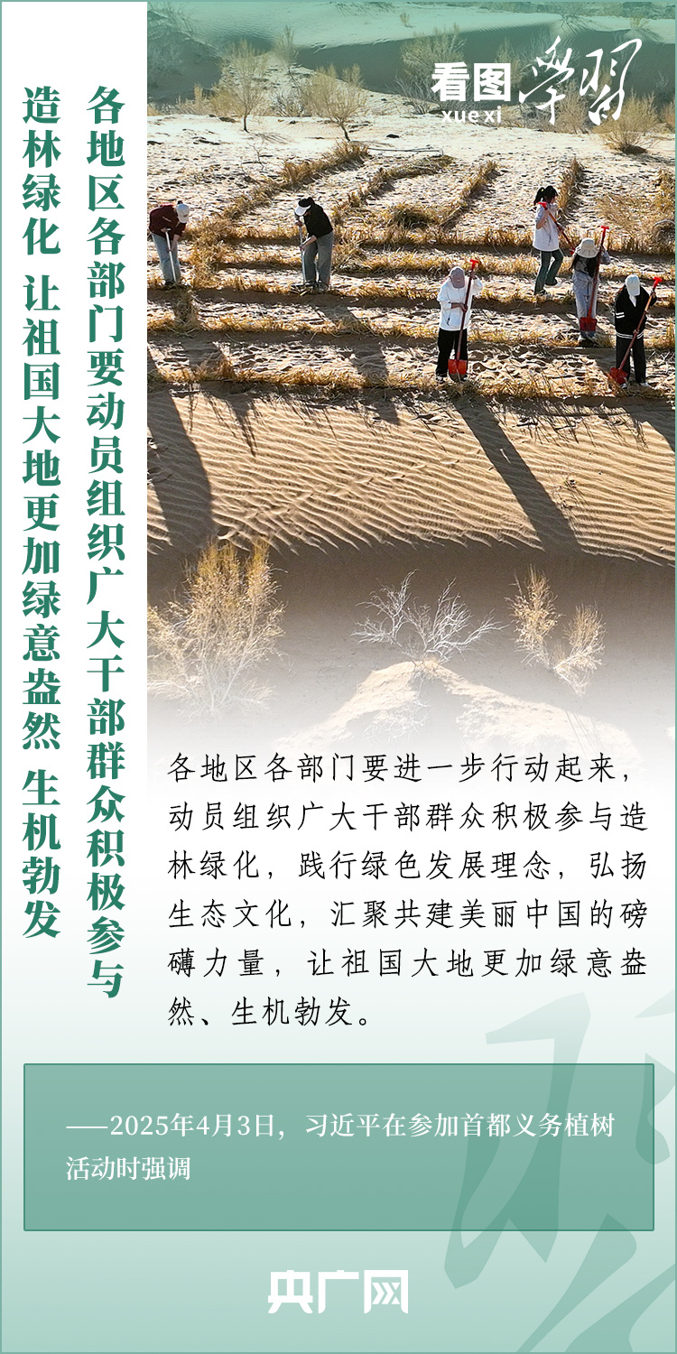 植樹造林是生態(tài)文明建設(shè)重要一環(huán)。4月3日,習(xí)近平總書記參加首都義務(wù)植樹活動。在植樹現(xiàn)場,總書記高度肯定國土綠化工作取得來之不易的成績,強調(diào)綠化祖國必須堅持“三綠”并舉、“四庫”聯(lián)動,要更加注重“提質(zhì)”“興業(yè)”“利民”,“匯聚共建美麗中國的磅礴力量,讓祖國大地更加綠意盎然、生機勃發(fā)”。一起來學(xué)習(xí)!