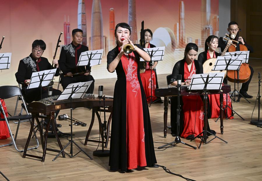 2023年11月24日,在馬來西亞雪蘭莪州的廈門大學(xué)馬來西亞分校,藝術(shù)家在音樂會上演奏。“絲路粵韻——廣東民族音樂會”當(dāng)晚在廈門大學(xué)馬來西亞分校舉辦。新華社記者程一恒攝