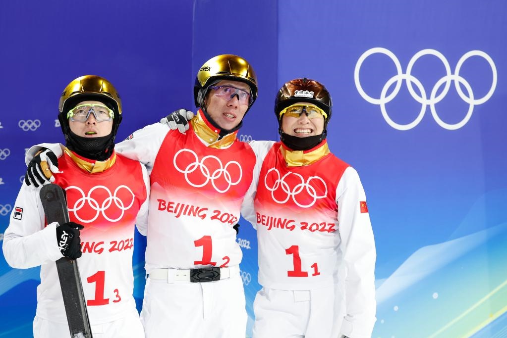 2月10日,中國(guó)隊(duì)選手賈宗洋(中)、徐夢(mèng)桃(右)和齊廣璞(左)在自由式滑雪空中技巧混合團(tuán)體比賽后等待成績(jī)公布。新華社記者費(fèi)茂華攝