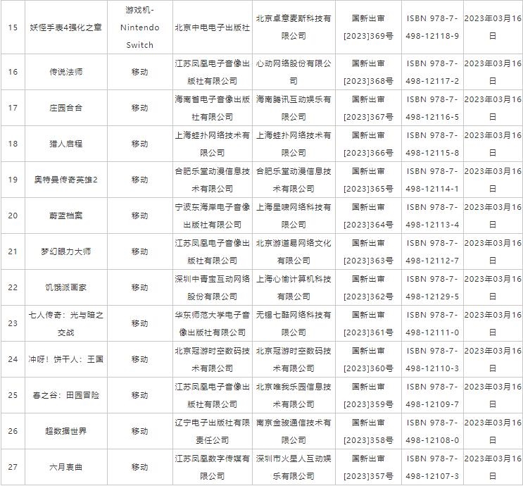 人民網(wǎng)北京3月21日電 (記者楊虞波羅)據(jù)國家新聞出版署官網(wǎng)消息,3月20日,2023年進(jìn)口網(wǎng)絡(luò)游戲?qū)徟畔⒄桨l(fā)布,共27款游戲獲得游戲版號,其中包含22款移動游戲、3款PC游戲、1款雙端游戲、1款NS游戲機(jī)游戲。