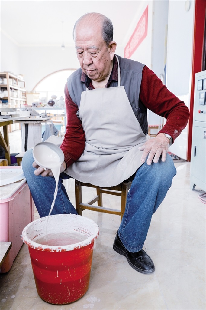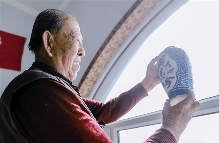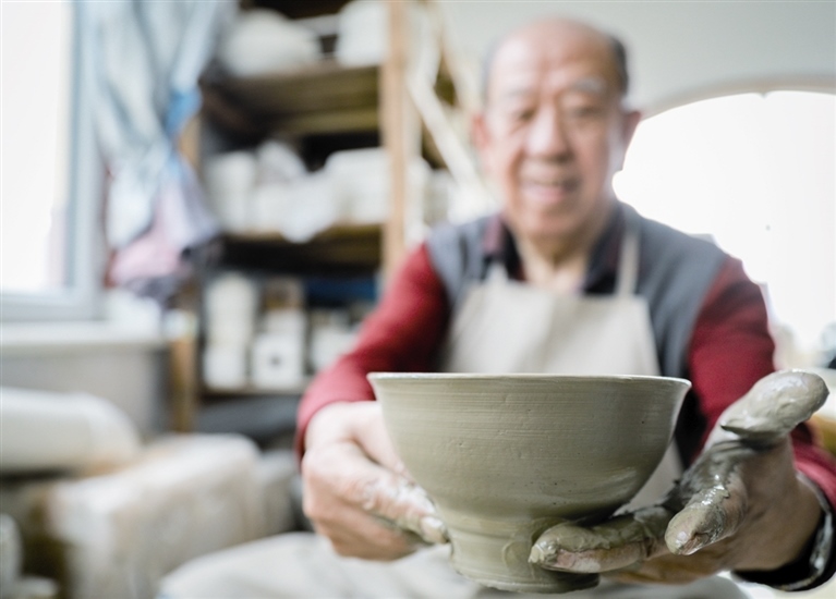隨后,他走進“饅頭窯”旁邊的一口窯洞,這是當時張家的一間手工作坊,揉泥、拉坯、上釉等一系列制作陶瓷的工序都是在這里完成?!拔揖统錾谶@個村子,已經(jīng)是張家瓷藝的第九代傳人了。作為中國磁州窯譜系,清水河黑礬溝瓷藝生產(chǎn)歷史至少已有800年?!标P(guān)于這項非遺的歷史故事,張選老人向記者娓娓道來:大約400年前,他們張家走西口從山西來到清水河謀生,當時清水河黑礬溝有一家姓杜的人家做陶瓷營生,張家的先人在杜家打工,大概這樣打工做了三輩人吧,杜家忽然不做了,搬離了黑礬溝,他們張家便把杜家的產(chǎn)業(yè)買了下來繼續(xù)做?!澳莻€時候黑礬溝生產(chǎn)的瓷器都與人們生活息息相關(guān),比如腌菜缸、水甕、碗盤等,一個家庭手工作坊一天能生產(chǎn)500個碗呢,生意很好,人們靠做這個營生也過上了不錯的生活?!睆堖x回憶著清水河瓷藝鼎盛時期的場景。上個世紀70年代,由于交通、技術(shù)等原因,黑礬溝燃燒了幾百年的窯火熄滅,傳統(tǒng)“饅頭窯”被正式廢棄,轉(zhuǎn)移到窯溝鄉(xiāng)后手工作坊變成了機械化生產(chǎn),這也讓清水河的陶瓷名聲大噪。當時,在窯溝鄉(xiāng)一帶,從事陶瓷生產(chǎn)的有近萬人,陶瓷業(yè)成為清水河支柱產(chǎn)業(yè)。