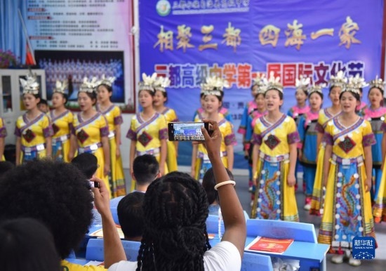 近日,“邂逅中國(guó)”來(lái)華留學(xué)生社會(huì)實(shí)踐活動(dòng)在貴州舉行。6月5日,來(lái)自突尼斯、巴基斯坦、老撾、巴西、印度尼西亞等國(guó)家的20名來(lái)華留學(xué)生來(lái)到貴州省黔南布依族苗族自治州三都水族自治縣的三都高級(jí)中學(xué),和學(xué)生們一起參加該校舉行的第一屆國(guó)際文化節(jié)。