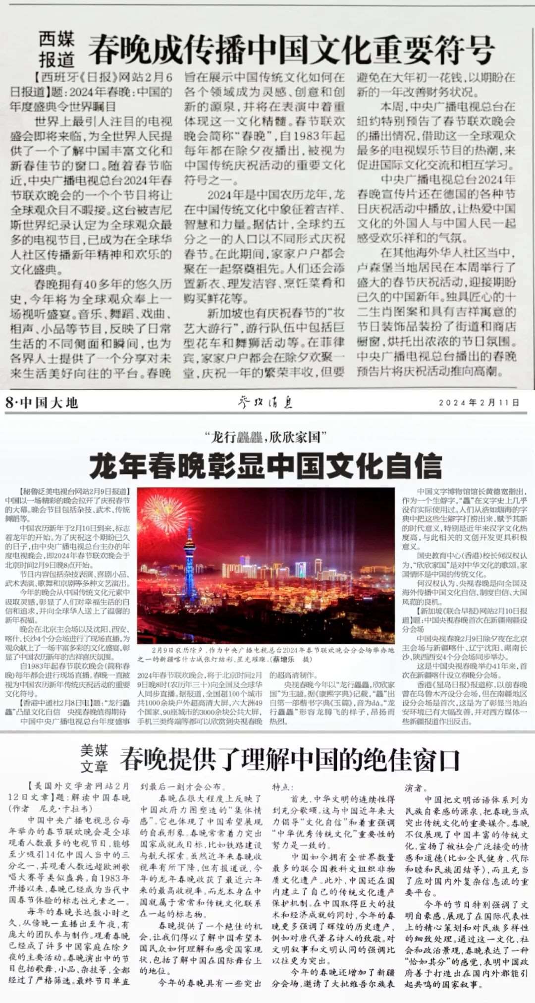 《參考消息》援引西班牙媒體評(píng)論稱,總臺(tái)龍年春晚為全世界人民提供了一個(gè)了解中國豐富文化的窗口,它展示中國傳統(tǒng)文化如何在各個(gè)領(lǐng)域成為靈感、創(chuàng)意和創(chuàng)新的源泉,并在音樂、舞蹈、戲曲等節(jié)目中體現(xiàn)傳統(tǒng)文化的精髓。秘魯、新加坡等媒體報(bào)道稱,龍年春晚彰顯了中國的文化自信。而美國《外交學(xué)者》網(wǎng)站署名文章認(rèn)為,龍年春晚為世界提供了理解中國的絕佳窗口。海外媒體的這些報(bào)道,不約而同地使用了“文化符號(hào)”“標(biāo)志性元素”等詞匯,并從促進(jìn)文化理解、推動(dòng)文化交流等角度對(duì)總臺(tái)春晚的海外影響力進(jìn)行解讀。