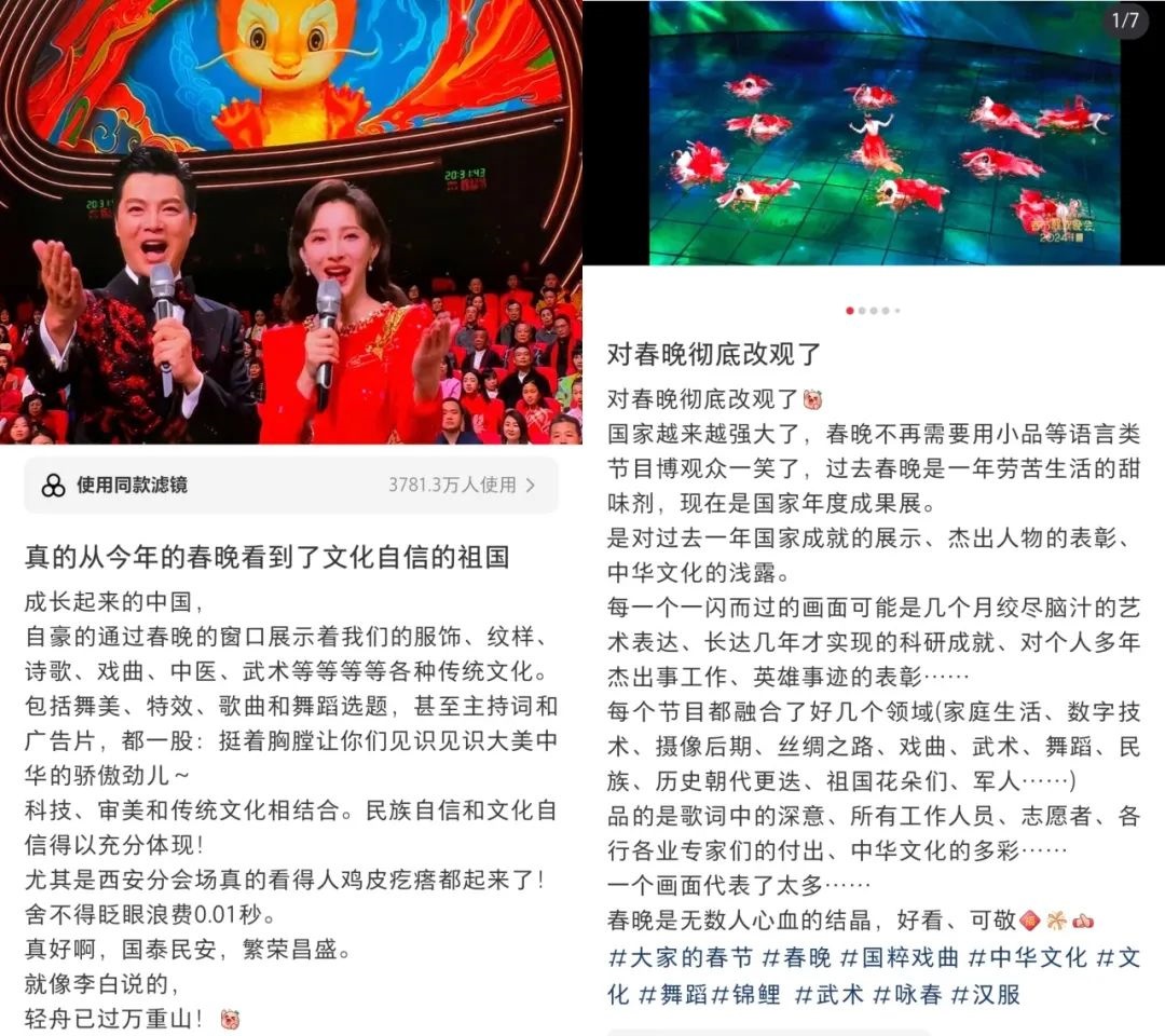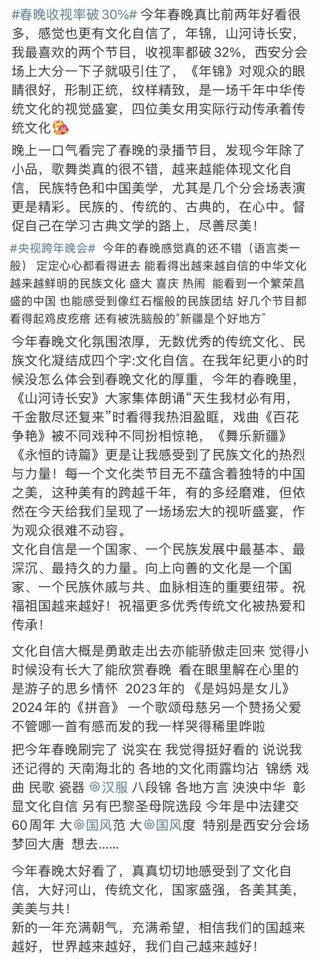 春晚的文化展現(xiàn),在國人中也引起了熱烈反響。“每一個(gè)文化類節(jié)目都蘊(yùn)含著獨(dú)特的中國之美,這種美有的跨越千年,有的多經(jīng)磨難,春晚給我們呈現(xiàn)了一場場宏大的視聽盛宴,作為觀眾很難不動(dòng)容”“從今年春晚真真切切地感受到了文化自信,大好河山,傳統(tǒng)文化,國家強(qiáng)盛,美美與共”“文化傳統(tǒng)特色給各個(gè)節(jié)目都刷了創(chuàng)意的漆,霸氣從節(jié)目中升騰,自信從感嘆中生發(fā),真妙”......