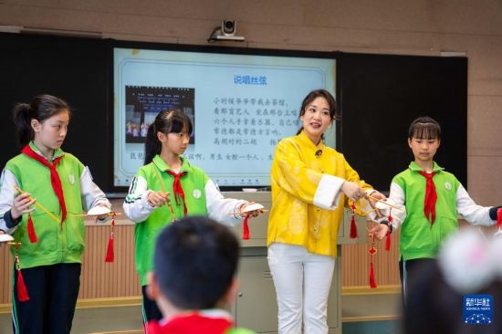 4月12日,在武陵區(qū)北正街小學,武陵區(qū)文化館工作人員(右二)和學生表演常德絲弦。