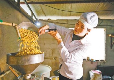 貴州省貴陽市修文縣久長鎮(zhèn)孟沖村一家豆腐加工作坊,工作人員將大豆舀入打漿機(jī)加工。周訓(xùn)超攝(人民視覺)