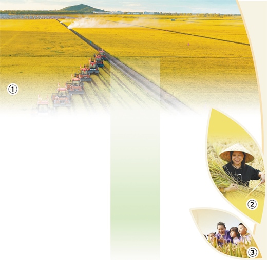 圖①:黑龍江省佳木斯市北大荒千萬畝水稻開鐮。國 徽攝(影像中國) 圖②:河北省唐山市水稻喜獲豐收。朱大勇攝(人民視覺) 圖③:山東省臨沂市沂南縣大莊鎮(zhèn)翔宇幼兒園的小朋友在稻田聽老師講解水稻種植知識。杜昱葆攝(人民視覺)