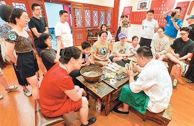 在東城區(qū)傳統(tǒng)韻味體驗(yàn)之旅中,游客在吉祥大戲院國粹京劇體驗(yàn)基地可以穿戴上京劇服裝道具,體驗(yàn)戲曲演員化妝過程,品嘗戲曲主題“吉祥咖啡”,觀看經(jīng)典京劇演出,與名師名家互動(dòng),零距離感受國粹經(jīng)典的魅力;在廣譽(yù)遠(yuǎn)中醫(yī)藥文化體驗(yàn)基地,游客通過聽中醫(yī)講解、辨藥材識優(yōu)劣、手工制作香囊等多種體驗(yàn)方式,感受中醫(yī)藥文化。在和平菓局京味文化體驗(yàn)基地,游客可以走進(jìn)煤廠胡同、小覺寺等老北京場景,體驗(yàn)拉洋片、草編藝術(shù)、皮影、捏面人等傳統(tǒng)京味文化。