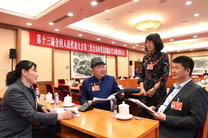 3月12日,內(nèi)蒙古代表團(tuán)的4名基層代表在全團(tuán)會(huì)議結(jié)束后,仍在熱議“兩高”報(bào)告。 內(nèi)蒙古日?qǐng)?bào)社融媒體記者 袁永紅 攝