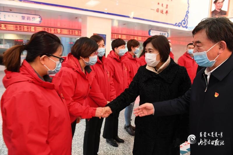 在烏蘭察布市蒙中醫(yī)院,布小林看望慰問(wèn)了援鄂醫(yī)務(wù)工作者。醫(yī)院16名醫(yī)護(hù)人員是烏蘭察布市首批支援湖北的逆行者,2020年1月28日奔赴湖北,在荊門(mén)市第一人民醫(yī)院、鐘祥市同仁醫(yī)院等醫(yī)療機(jī)構(gòu)奮戰(zhàn)50多天。布小林與他們一一握手表達(dá)敬意和感謝。她動(dòng)情地說(shuō),你們?cè)谧钗<钡臅r(shí)刻挻身而出,義無(wú)反顧沖向抗疫一線,頑強(qiáng)拼搏,無(wú)私奉獻(xiàn),圓滿完成援鄂任務(wù),每一個(gè)人都非常了不起。目前的疫情防控形勢(shì)依然嚴(yán)峻復(fù)雜,希望大家繼續(xù)忠實(shí)履行醫(yī)務(wù)工作者的神圣職責(zé),同時(shí)要加強(qiáng)個(gè)人防護(hù)。她要求醫(yī)院精心做好內(nèi)部疫情防控工作,關(guān)心關(guān)愛(ài)醫(yī)護(hù)人員的身心健康。
