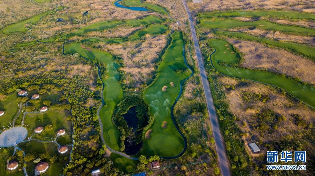 這是位于庫(kù)布其沙漠中的七星湖景區(qū)(2018年7月11日攝,無人機(jī)照片)。新華社記者 彭源 攝