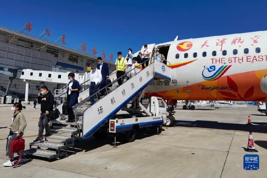 旅客乘坐航班從呼和浩特抵達(dá)錫林浩特機(jī)場(chǎng)。新華社記者李云平攝