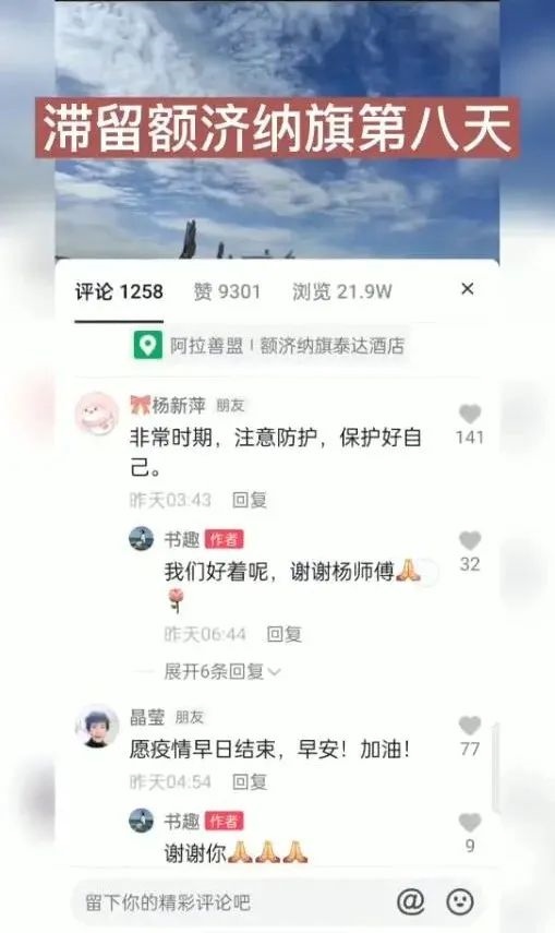視頻發(fā)出數(shù)小時(shí)就吸引了上萬的瀏覽量。視頻發(fā)布者王女士在視頻中呈現(xiàn)一家人滯留額濟(jì)納旗現(xiàn)況的同時(shí),也給和她同樣滯留額濟(jì)納旗的近萬名游客鼓勁:“如果你此時(shí)正在阿拉善,愿你如胡楊般堅(jiān)強(qiáng),積極應(yīng)對(duì)疫情?!?/p>