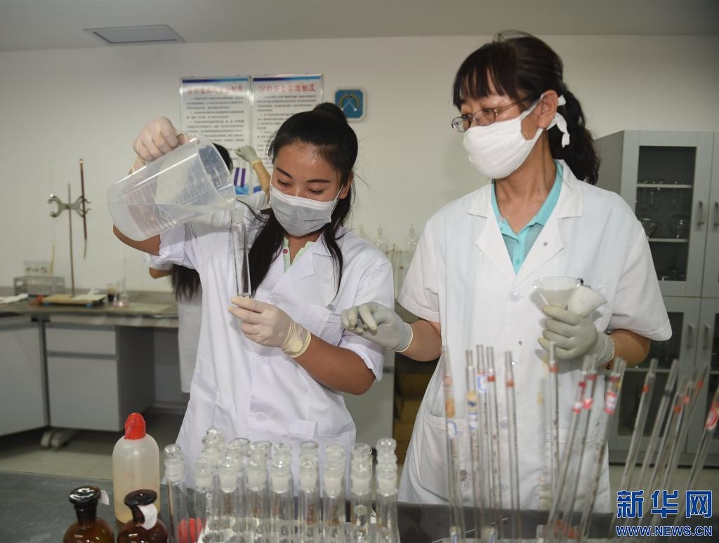 2017年7月12日,巴彥淖爾市農(nóng)村牧區(qū)飲水安全水質(zhì)檢測中心工作人員在進(jìn)行水樣檢測。新華社記者鄧華 攝