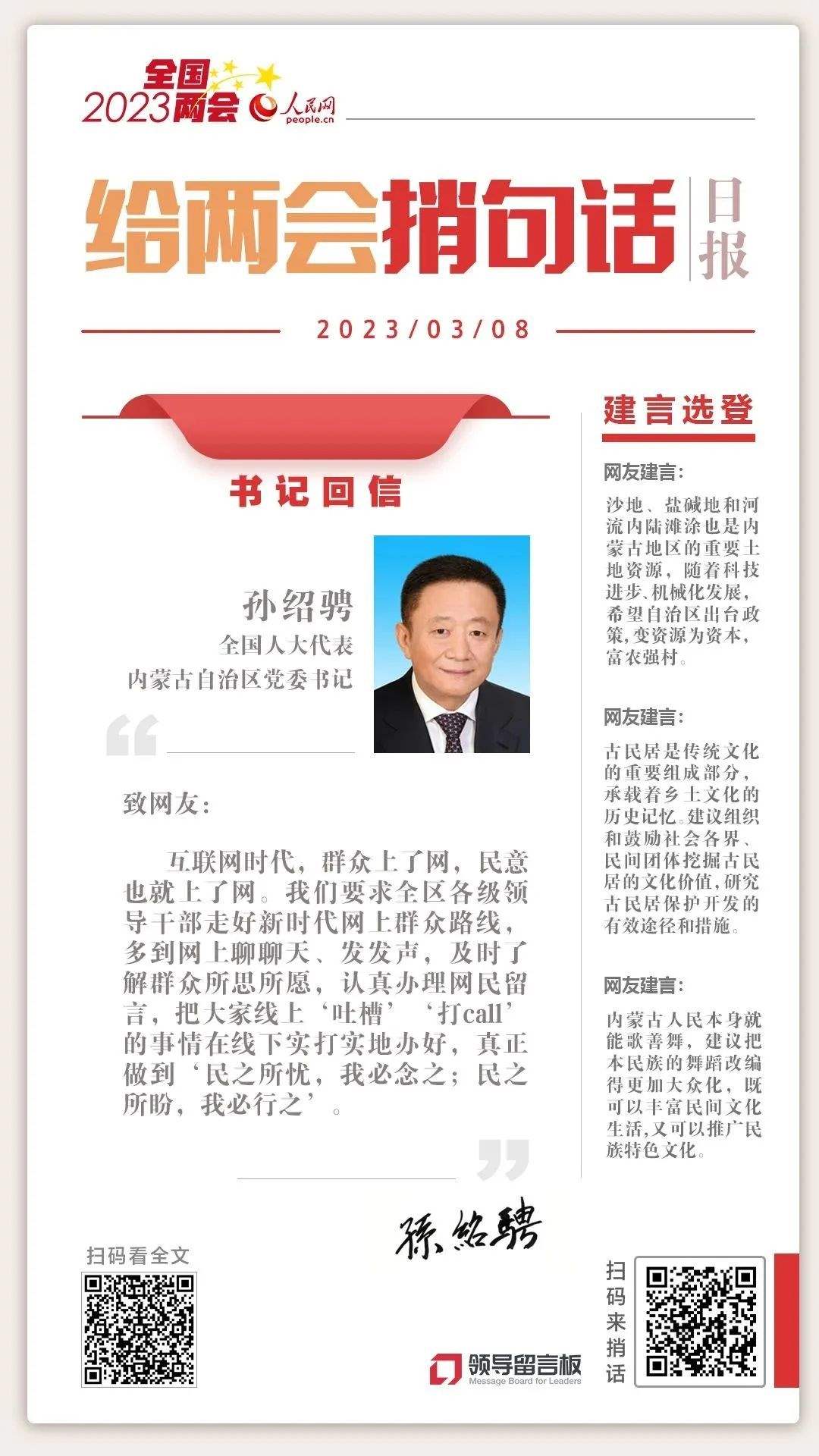 人民網2023年度“我給兩會捎句話”建言征集活動正在進行,廣大網友關注并積極參與。近日,部分中央部委領導,地方的省委書記、省長陸續(xù)通過人民網致信網友,回應群眾關切。人民網將持續(xù)刊發(fā)。