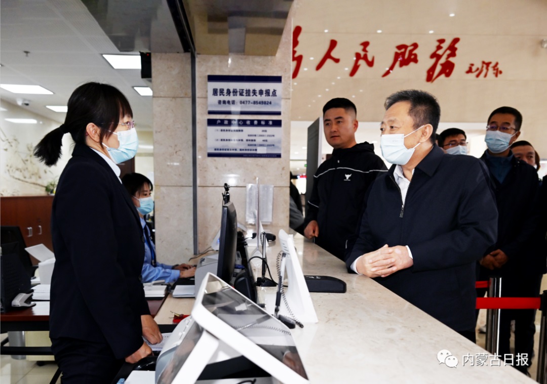 4月21日,孫紹騁在鄂爾多斯市東勝區(qū)政務(wù)服務(wù)中心向窗口工作人員詢問便民服務(wù)情況。內(nèi)蒙古日報(bào)社融媒體記者馬建荃攝