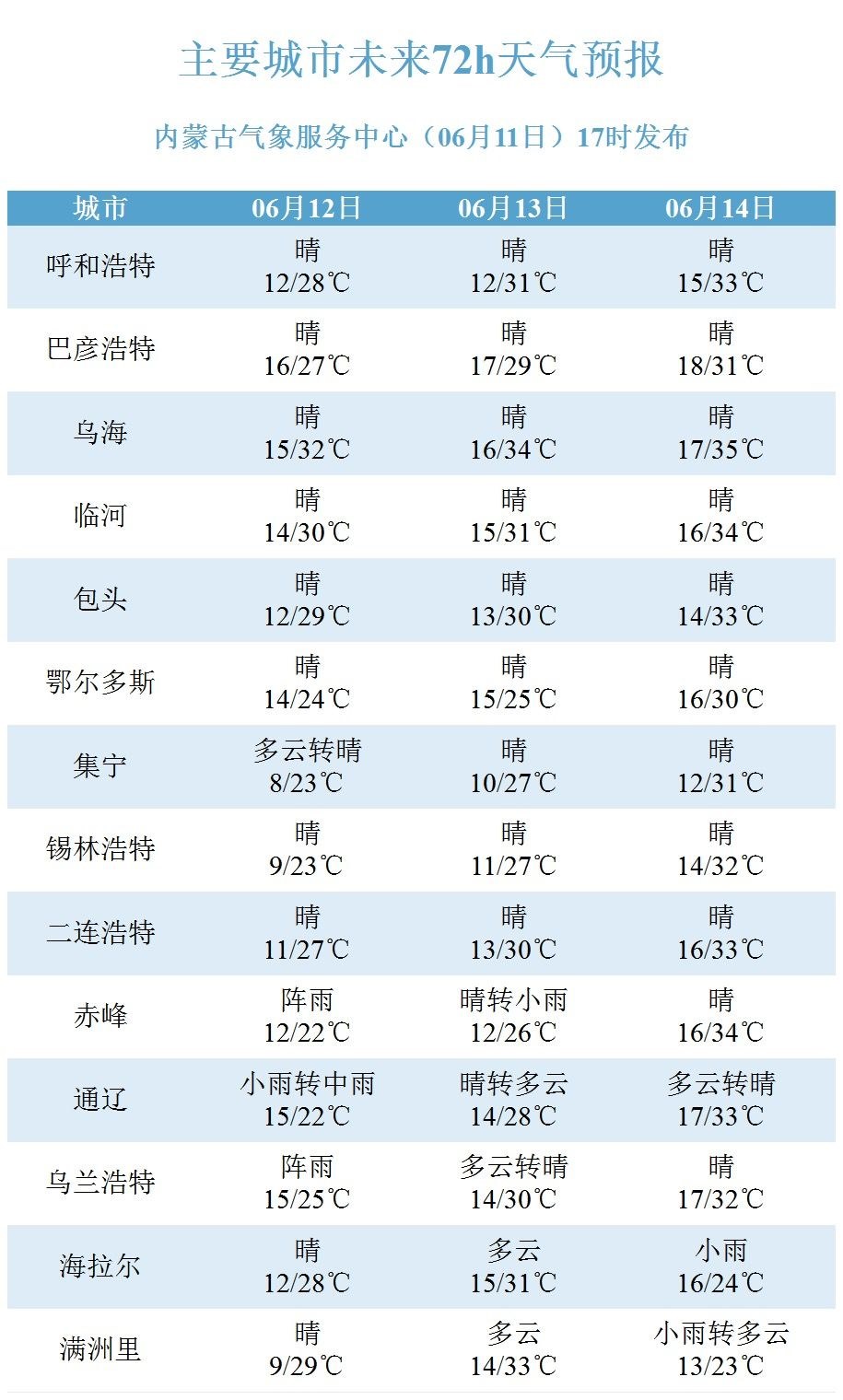 6月13日前后,內(nèi)蒙古中西部地區(qū)的氣溫就會超過30℃,臨河、烏海等地會達到35℃。到6月15日,不僅西部的阿拉善盟、巴彥淖爾市等地將出現(xiàn)大范圍35℃以上的高溫天氣,中部的包頭市、呼和浩特市35℃以上的高溫天氣也將迅速增多。