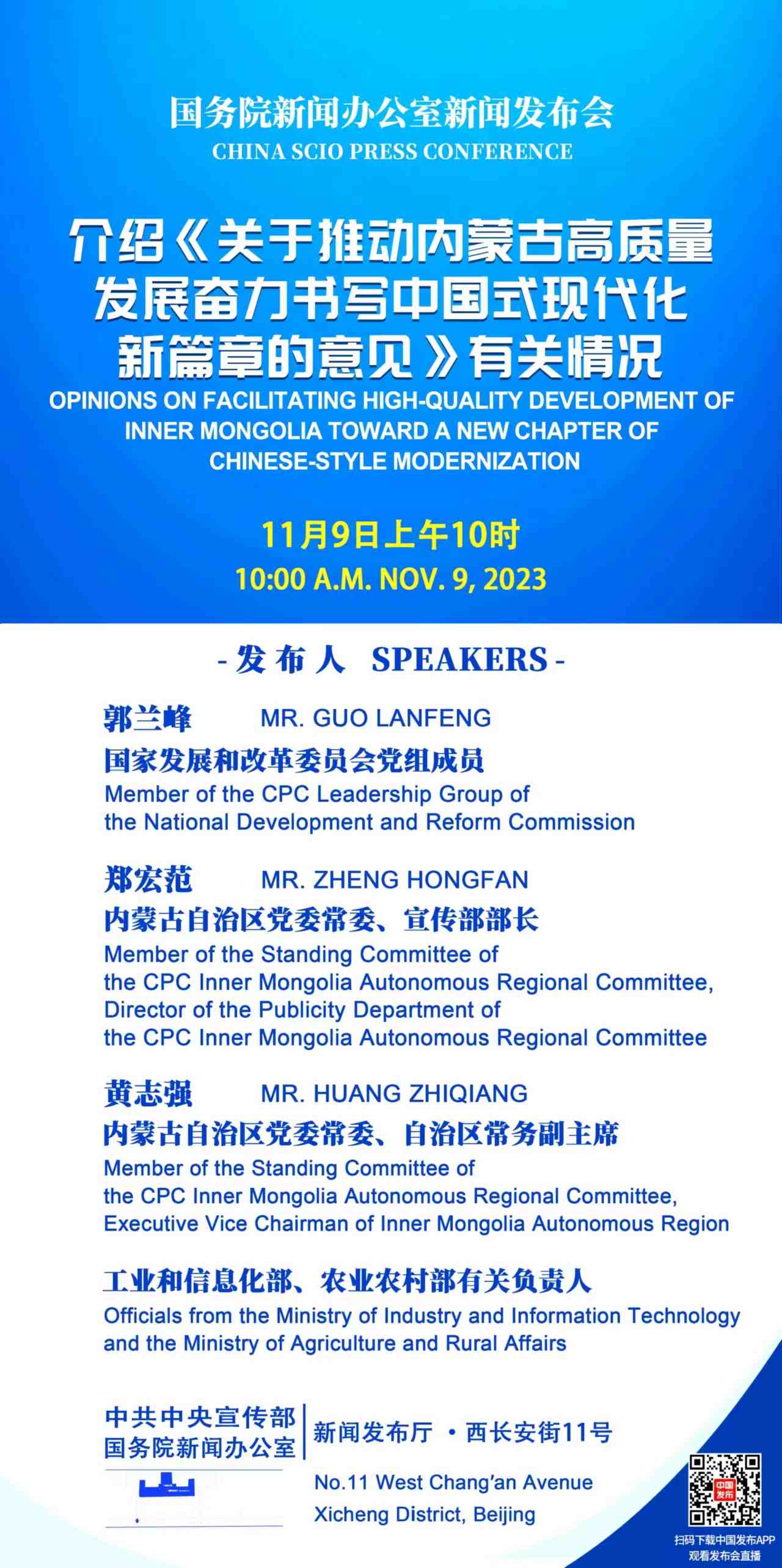 2023年11月9日(星期四)上午10時,國務院新聞辦公室舉行新聞發(fā)布會,請國家發(fā)展和改革委員會黨組成員郭蘭峰,內(nèi)蒙古自治區(qū)黨委常委、宣傳部部長鄭宏范,內(nèi)蒙古自治區(qū)黨委常委、自治區(qū)常務副主席黃志強和工業(yè)和信息化部、農(nóng)業(yè)農(nóng)村部有關負責人介紹《關于推動內(nèi)蒙古高質量發(fā)展奮力書寫中國式現(xiàn)代化新篇章的意見》有關情況,并答記者問。