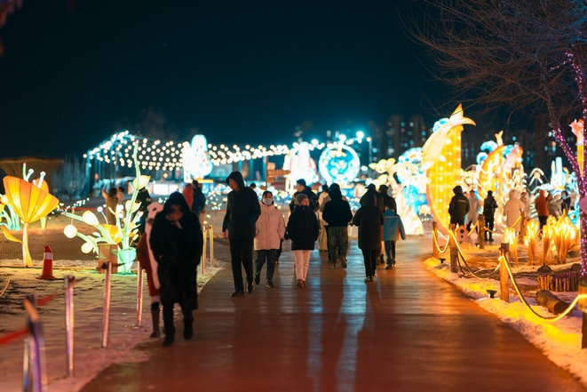 當晚,呼和浩特零下15攝氏度左右,寒冷擋不住市民欣賞流光溢彩的燈會,只見市民穿著保暖的外套,戴著帽子手套,一邊逛燈會,一邊拍照片、拍視頻,還有的市民開直播,與全國各地的網(wǎng)友一起分享這美好時刻。