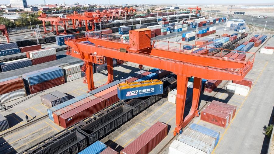 ??這是2023年10月18日在二連浩特鐵路口岸拍攝的中歐班列貨運(yùn)吊裝作業(yè)現(xiàn)場。新華社發(fā)(郭鵬杰 攝)