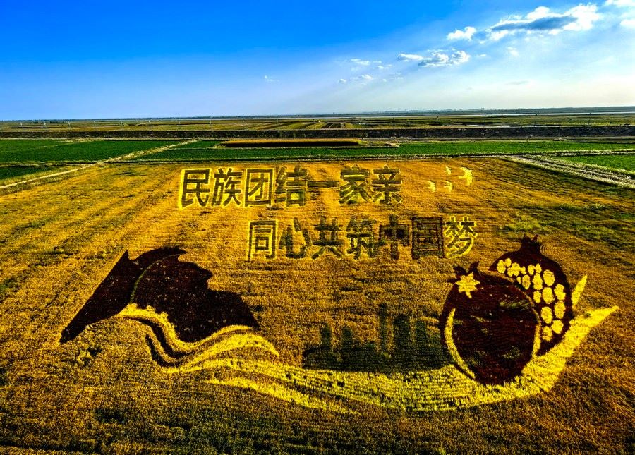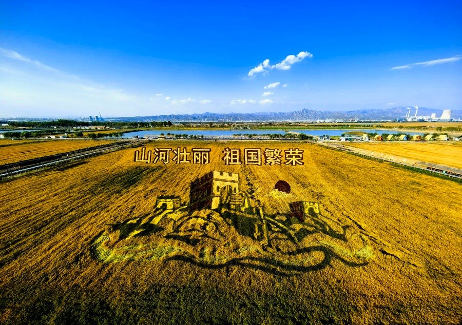 9月26日,內(nèi)蒙古包頭市東河區(qū)沙爾沁鎮(zhèn)什大股村,金色的稻浪掩映下,一幅壯美的稻田畫,在金秋時節(jié)格外引人注目。