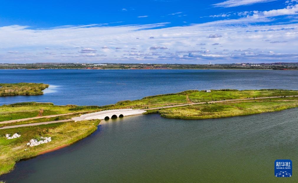 ??這是9月19日拍攝的鄂爾多斯市康巴什區(qū)烏蘭木倫湖與百康橋(無人機(jī)照片)。