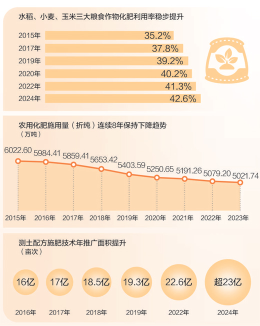 2024年,我國水稻、小麥、玉米三大糧食作物化肥利用率為42.6%,比2022年提高1.3個百分點?;世寐?,即化肥被作物吸收利用的比例,反映了化肥在農(nóng)業(yè)生產(chǎn)中的有效利用程度??茖W(xué)施肥效果提升,折射農(nóng)業(yè)發(fā)展方式之變。