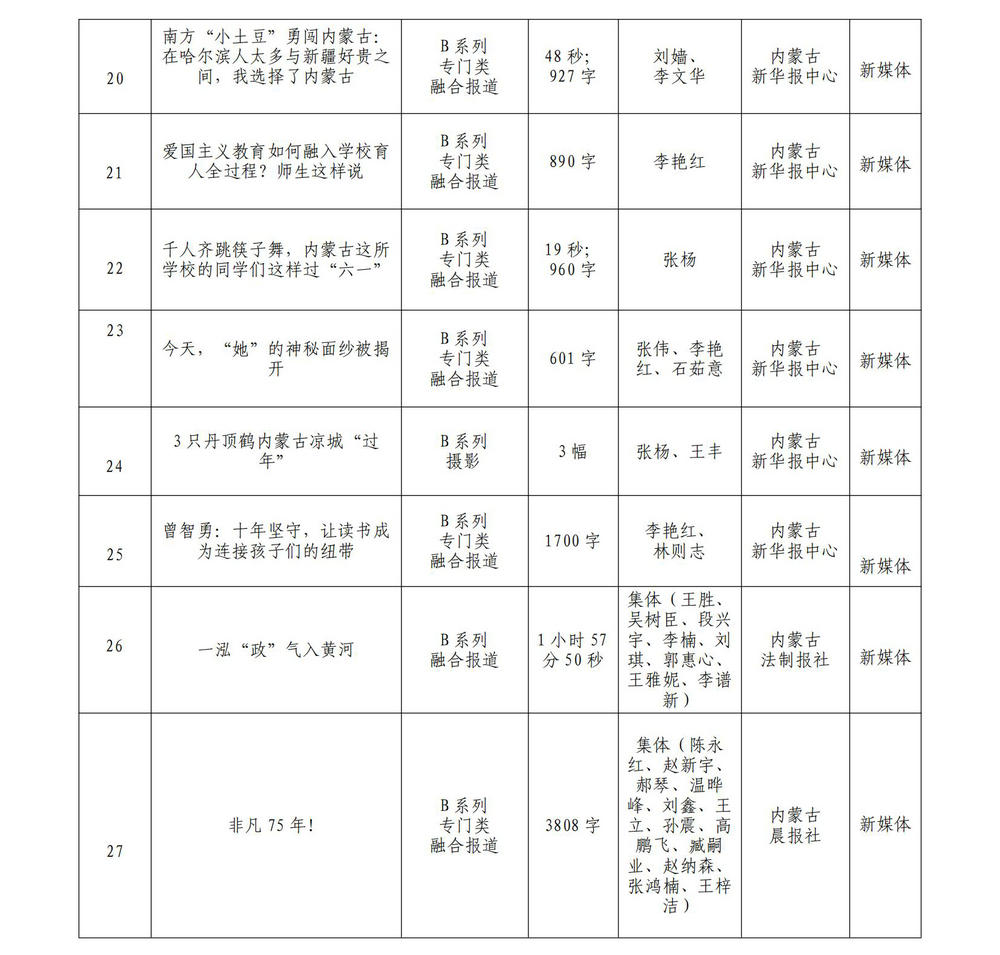按照新聞獎(jiǎng)評(píng)選辦法要求,內(nèi)蒙古新華報(bào)業(yè)中心現(xiàn)對(duì)擬報(bào)送第33屆內(nèi)蒙古新聞獎(jiǎng)暨第35屆中國(guó)新聞獎(jiǎng)參評(píng)作品進(jìn)行公示,歡迎社會(huì)各界監(jiān)督、評(píng)議。