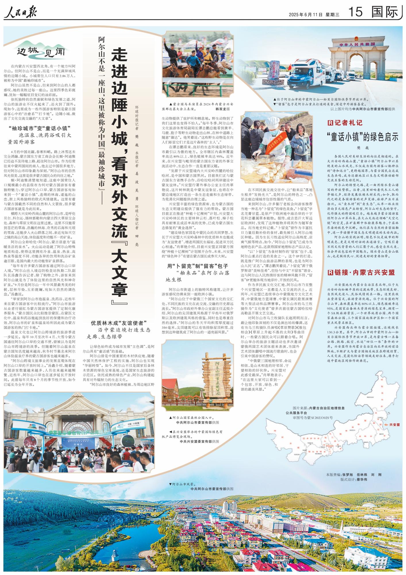 2025年6月11日,《人民日?qǐng)?bào)》第15版刊發(fā)整版文章《阿爾山不是一座山,這里被稱為中國(guó)“最袖珍城市”——走進(jìn)邊陲小城,看對(duì)外交流“大文章”》,報(bào)道了依托獨(dú)特的自然稟賦和綠色發(fā)展之道,阿爾山的旅游業(yè)火起來了?,F(xiàn)如今,這里成為一些外國(guó)游客特別是蒙古國(guó)游客心中的“治愈系”“打卡地”。邊陲小城,做出了文化交流交融的“大文章”。