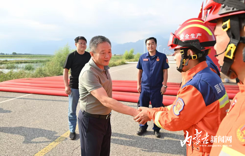 8月23日,自治區(qū)黨委書記孫紹騁在哈素海強排區(qū)沿著堤壩逐一看望連日堅守崗位的應(yīng)急救援人員。草原云·內(nèi)蒙古新聞網(wǎng)記者 馬建兵 攝