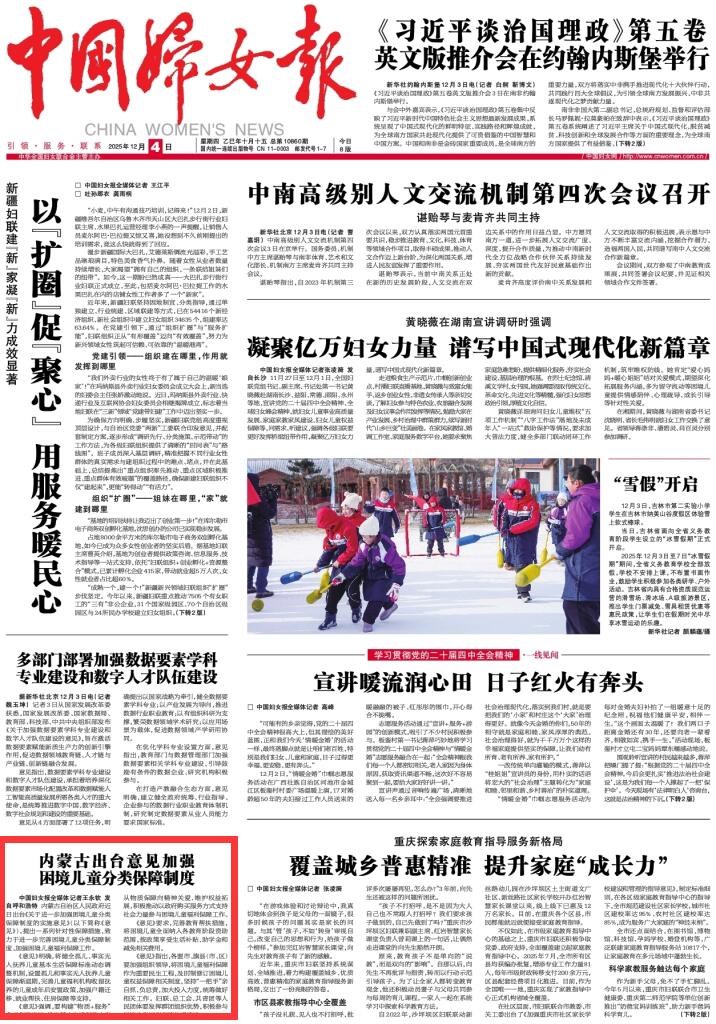 2025年12月4日《中國婦女報(bào)》第1版刊發(fā)了《內(nèi)蒙古出臺意見加強(qiáng)困境兒童分類保障制度》的文章,報(bào)道了內(nèi)蒙古自治區(qū)人民政府近日出臺《關(guān)于進(jìn)一步加強(qiáng)困境兒童分類保障制度的實(shí)施意見》,提出一系列針對性保障措施,致力于進(jìn)一步完善困境兒童分類保障制度,加強(qiáng)困境兒童福利保障工作。