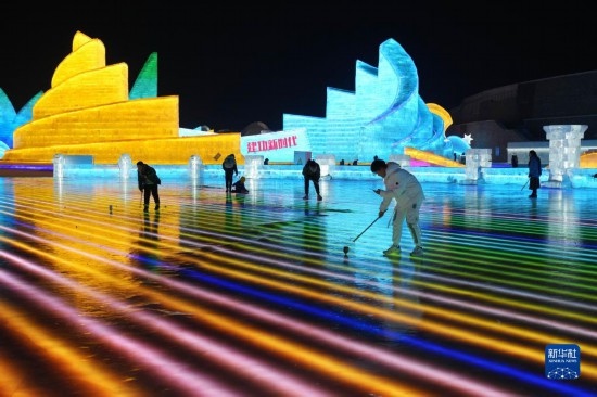 2月25日,游客在哈爾濱冰雪大世界園區(qū)游玩。