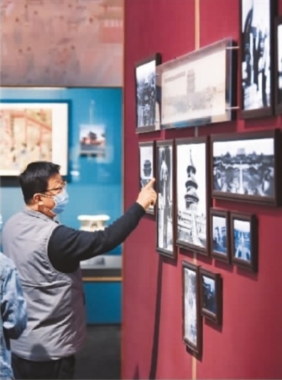 參觀者欣賞北京中軸線老照片。新華社記者 陳鐘昊攝