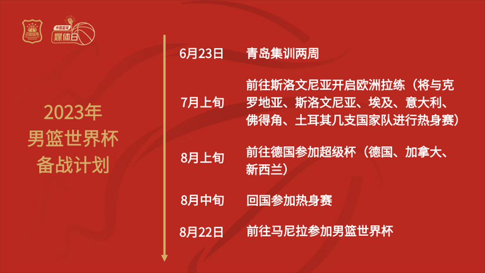 談到中國男籃備戰(zhàn)世界杯的具體規(guī)劃時,徐濟(jì)成表示:“球隊(duì)將于6月23日在青島開啟為期兩周的集訓(xùn);7月上旬前往斯洛文尼亞開啟歐洲拉練,將與克羅地亞、斯洛文尼亞、埃及、意大利、佛得角、土耳其幾支國家隊(duì)進(jìn)行熱身賽;8月上旬前往德國參加超級杯,對手包括德國、加拿大、新西蘭;8月中旬回國參加1-2場熱身賽后,將前往馬尼拉參加男籃世界杯?!?/p>