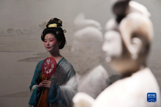 5月22日晚,在西安博物院《長(zhǎng)安有故里——絲路少年大唐行》展覽上,身著復(fù)原唐裝的演員與游客互動(dòng)。