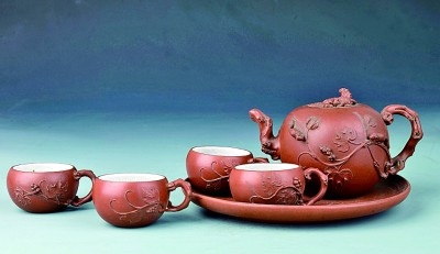 在陶瓷單元,來自全國七個產(chǎn)區(qū)的陶器、瓷器和陶瓷雕塑在材料、工藝、功能、題材、造型、裝飾等方面各具特色。江蘇宜興紫砂陶器因透氣性能優(yōu)良,以茶具、花盆聞名。清初名家陳孟瀛的“紫砂水仙盆”造型質(zhì)樸,書畫裝飾清新雅致;現(xiàn)代名家朱可心的茶具以松鼠葡萄為題材,寓意多子多福、豐收吉祥。云南建水紫陶多以不同顏色的陶泥刻填書畫,形成具有地方特色的“殘?zhí)毖b飾,文人氣息濃厚,如向逢春的“紫陶刻填殘?zhí)B紋瓶”,丁吉三制陶、馬吉生作畫、孟松題詩的“紫陶雙耳四方瓶”等。湖南銅官陶器以綠色、褐色釉為主,多為雙連調(diào)味罐、水壺等日用器皿。安徽界首陶器的剔地留花工藝和武戲“刀馬人”裝飾獨具特色,名家以盧山義為代表。江西景德鎮(zhèn)是傳統(tǒng)瓷區(qū),產(chǎn)量大,行銷廣,青瓷、青花、古彩等品種豐富,彩繪、浮雕等工藝精湛,如“青花龍紋盤”以鏤雕透光的“玲瓏眼”工藝為特色;“青瓷浮雕一品當朝紋盤”繪仙鶴立于潮頭,寓意聲名顯赫;名家王步的“青花白菜圖盤”以中國傳統(tǒng)繪畫兼工帶寫的手法繪制白菜形象,既富生活雅趣,又寓發(fā)財之意。江西美術工作室則以現(xiàn)實題材、寫實風格為特色,曾龍升創(chuàng)作的瓷塑“牧童牛上比英雄”傳遞出“老幼互相忙生產(chǎn),要為祖國立大功”的時代之聲。福建德化白瓷以瓷塑見長,傳統(tǒng)題材為主。廣東石灣陶器則以陶塑見長,題材多具自然情趣與生活氣息,亦有表現(xiàn)時代題材的作品。