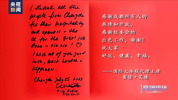 國(guó)際大體聯(lián)代理主席雷諾·艾德在接受總臺(tái)專訪后題詞:感謝成都所有人的熱情和開放,感謝組委會(huì)的出色工作,謝謝!祝大家好運(yùn)、健康、幸福。