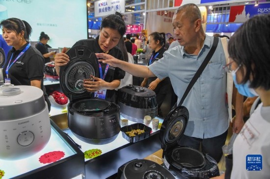 8月23日,在第十四屆中國—東北亞博覽會(huì)東北亞商品館,參展商向參觀者介紹韓國電器。