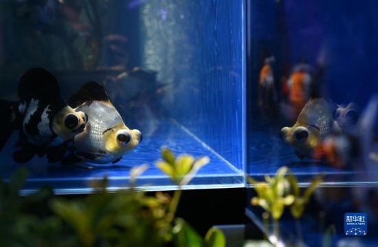 這是展出的熊貓蝶尾金魚(8月28日攝)。