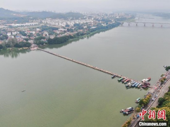 圖為10月2日,航拍橫臥于貢江之上的贛州東河浮橋。東河浮橋始建于南宋乾道年間,距今已有800多年歷史,該浮橋全長約400米,連接贛州主城區(qū)和對(duì)岸的水東鎮(zhèn),方便著兩岸民眾的出行。劉力鑫 攝
