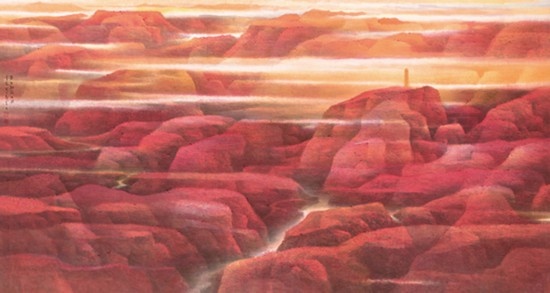 來自上海并深受海派畫學影響的樂震文、張弛,在宋元及明清山水畫學上打下了深厚的功底,也因此,他們的傳統(tǒng)山水畫深受日本民眾的歡迎。他們曾游居東瀛多年,轉(zhuǎn)道再度研習了中國傳統(tǒng)文人畫。但真正改變他們畫風的,卻是他們對中國北方大山大水的寫生攬勝。他們鐘情于英雄的太行山,忘情于革命勝地陜北高原,力求通過壯闊雄渾的山巒、連綿逶迤的群峰來表達他們的時代感悟,營構(gòu)儲存于他們胸中的山川氣象。所謂“山河回聲”,正是這些作品抒發(fā)的中華民族歷經(jīng)歲月風華在大好河山之中回響的奮斗激情。