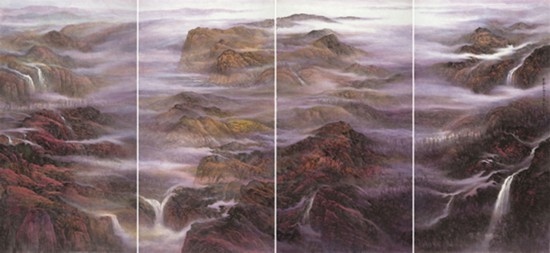 且看樂震文的《直上浮云》《云卷云舒》和《黃土馳風,日月星辰》,那逶迤茫茫的群山峻嶺,那縱橫畫面的云蒸霞蔚,那連綿不絕的箭樓城堞,哪里還是傳統(tǒng)文人山水畫的淡煙輕嵐,縹緲冷逸?濃縮于畫內(nèi)的精神意蘊,分明凸顯了現(xiàn)代山水畫對家國情懷的抒發(fā)。且讀張弛的《云起疊嶂》《惟余莽莽》和《紫氣氤氳》,那天光紫氣的浩渺煙云,那渾然一體的山水氣象,那千回百轉(zhuǎn)的流水飛泉,其實早已脫離了對自然山水的寫照,而是她感悟的時代精神在偌大畫面上的縱橫揮寫、主觀臆造。