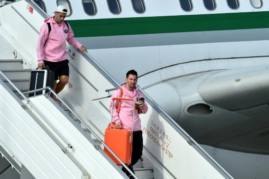 2月2日,梅西與其效力的邁阿密國際隊抵達香港國際機場,圖為梅西(右)與蘇亞雷斯走下舷梯。新華社記者 盧炳輝 攝