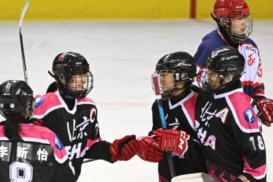 2月16日,第十四屆全國冬季運(yùn)動會冰球項(xiàng)目女子青年組小組循環(huán)賽A組比賽中。新華社記者 鄧華 攝