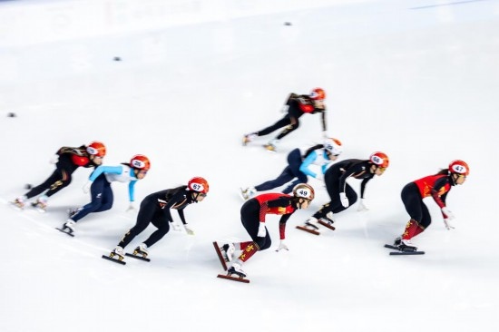 2月17日,第十四屆全國冬季運(yùn)動會短道速滑(公開組)女子3000米接力半決賽中。新華社記者 黃偉 攝