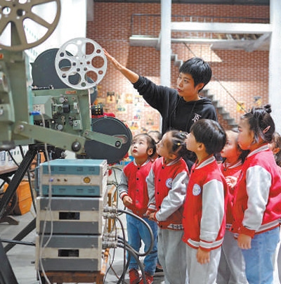 湖州市南潯鎮(zhèn)橫街電影博物館內(nèi),老師帶領(lǐng)孩子們了解電影放映機(jī)。張 斌攝