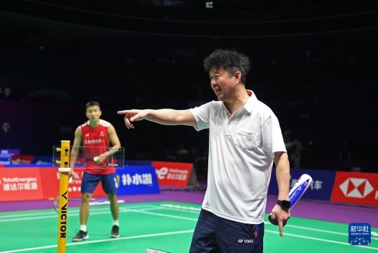 4月26日,中國羽毛球協(xié)會副主席夏煊澤(右)在訓(xùn)練中指導(dǎo)王祉怡。新華社記者 侯昭康 攝