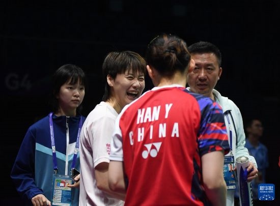 4月26日,陳雨菲(左二)與韓悅(右二)在訓(xùn)練中交流。新華社記者 侯昭康 攝